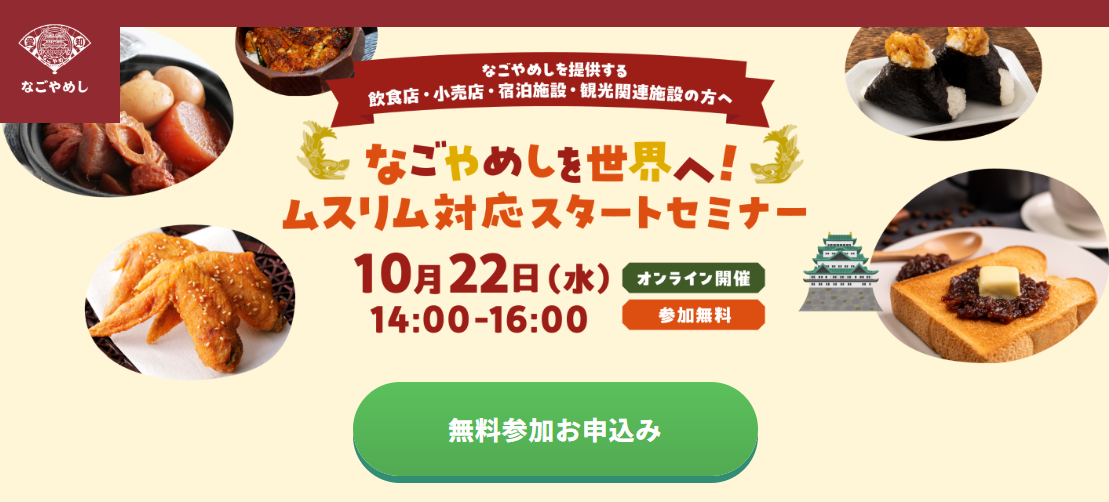 専門家や在住ムスリムの方を講師に迎え、「なごやめし」に特化した対応の基礎から実例までを知ることができるオンラインセミナーとなっています。皆様のご参加を心よりお待ちしております。